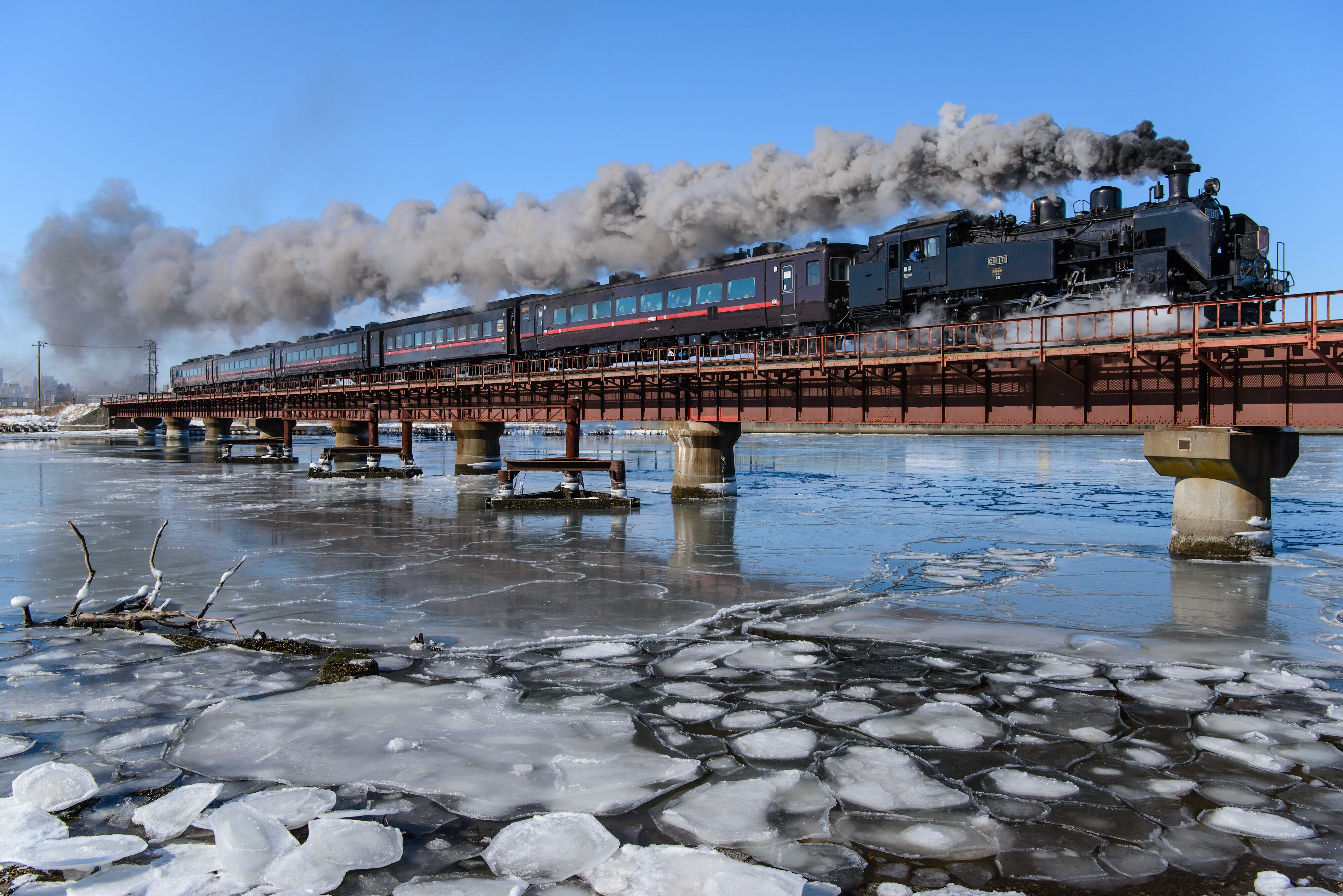 釧路川鉄橋をいくSL冬の湿原号と、釧路川の蓮氷。
